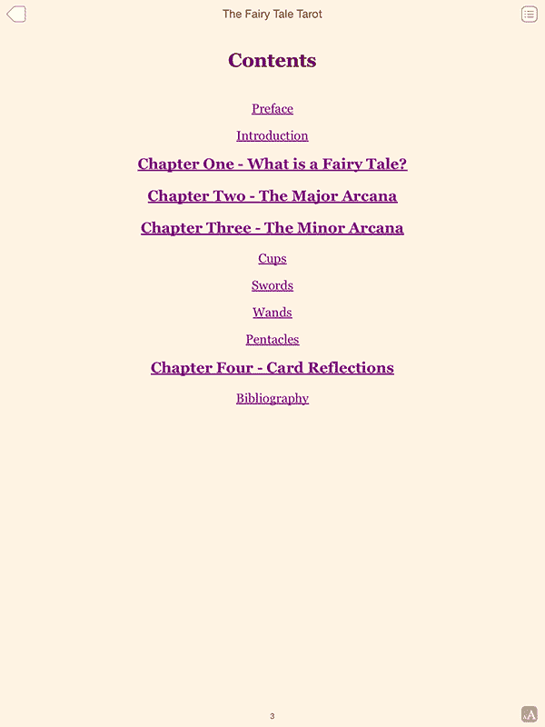 Many of the Major Arcana are renamed in a fairy tale manner, such as Innocence for The Fool, The Fairy Godmother for The Empress, and Happily Ever After for The World. The elemental suits are artfully referenced in the Minor Arcana. The characters and plot of each fairy tale subtly convey the traditional meanings of the RWS cards.