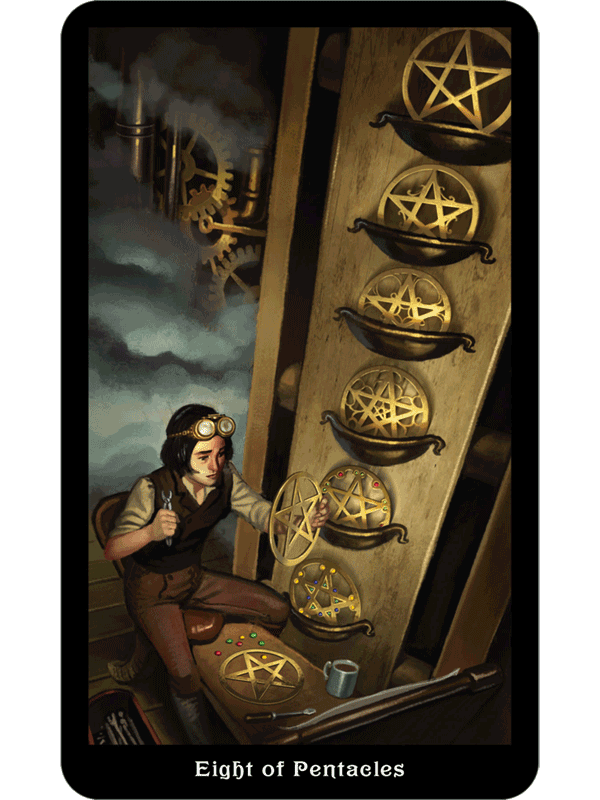 The Steampunk Tarot is an electric marriage of science and alchemy, nature and technology, human and machine. 78 evocative cards radiantly retool the images from Pamela Colman Smith’s Classic 1910 Tarot.